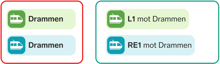 Although color can be useful for presenting information in a simple way, it should not be the only way to convey information. When using color to differentiate between elements, there should always be other elements like text or shape that help the user identify the difference. An example is the distinction between two different train lines that go between the same stations. Here, it would be difficult to differentiate by using only line color, therefore it is necessary to have, for example, a line ID.